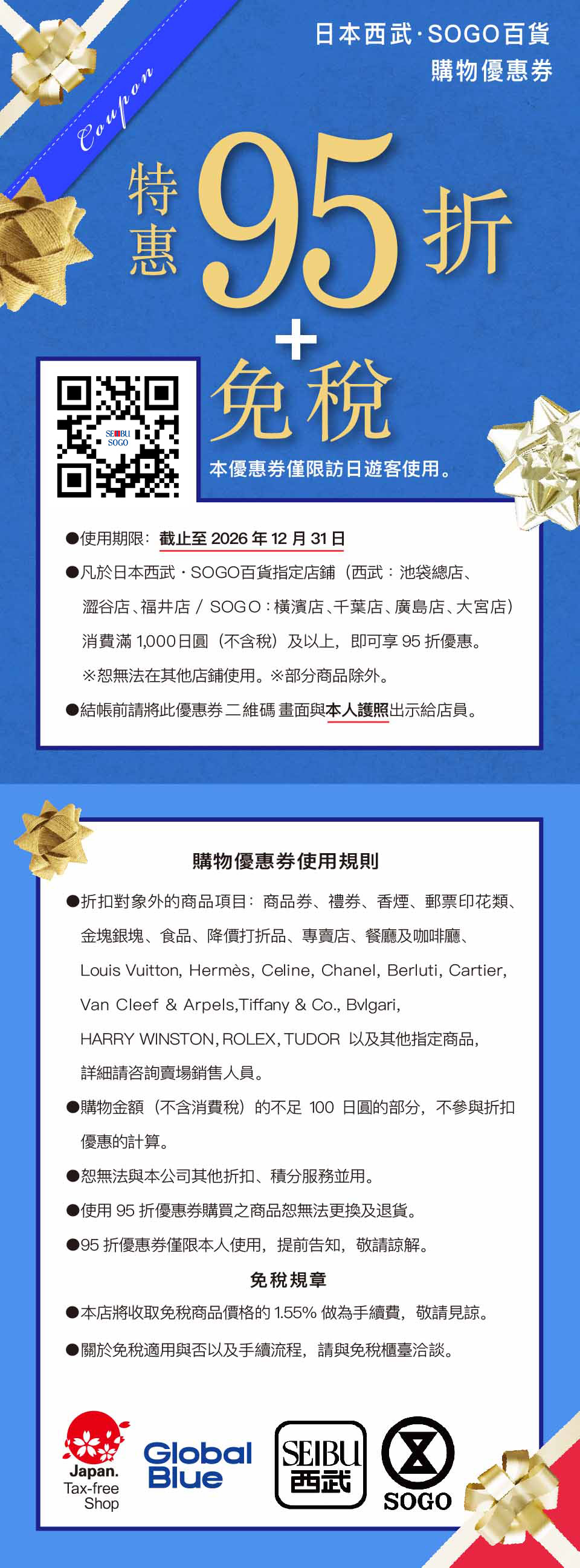 - 本優惠券適用於西武・崇光百貨各店,單筆消費滿1,000日圓(不含稅)即可享受5%折扣。