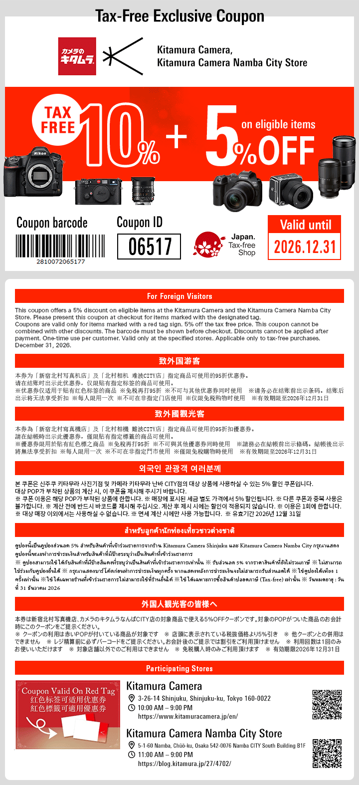 Founded in 1934, Kitamura Camera operates approximately 600 locations nationwide. Its flagship stores, Shinjuku Kitamura Camera and Namba City, offer the largest inventories of new and used cameras in Japan. Shinjuku Kitamura Camera is a 4-minute walk from the East Exit of JR Shinjuku Station and the Namba City store can be directly accessed from Namba Station.